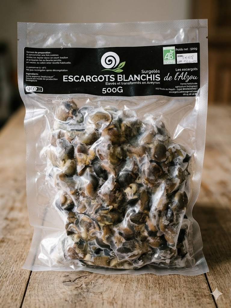 Mes escargots blanchis (500 g) sont soigneusement préparés et précuits pour vous faire gagner du temps en cuisine. Tendres et savoureux, ils se prêtent à toutes les recettes : beurre persillé, gratin, ou feuilleté croustillant. La qualité professionnelle, prête à sublimer vos plats !